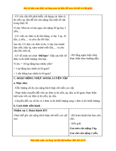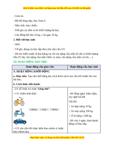 - Cân đồng hồ trên 10 kg, 1 túi g o ạ 10 kg. 2. Đ i ố v i ớ h c s ọ inh - SHS. - Vở ghi, d ng c ụ h ụ c ọ t p t ậ heo yêu c u c ầ a ủ GV. - HS tìm hi u ể trư c ớ nhà t ở hông tin v cân n ề ng ặ c a m ủ t ộ số v t ậ có kh i ố lư ng ợ l n ( ớ Ví d : ụ cân n ng ặ c a m ủ t ộ chi c xe m ế áy, cân n ng ặ c a m ủ t ộ con bò,…). III. HOẠT Đ N Ộ G D Y Ạ H C Ọ Hoạt đ ng c ộ a g ủ iáo viên Hoạt đ ng c ộ a h ủ c s ọ inh A. HOẠT Đ N Ộ G KH I Ở Đ N Ộ G a. Mục tiêu: T o t ạ âm th h ế ng t ứ