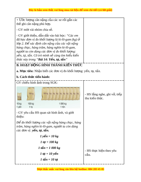 rong “Bài 14: Y n, t ế ạ, tấn” B. HO T Ạ Đ N Ộ G HÌNH THÀNH KI N Ế TH C Ứ a. Mục tiêu: Nh n bi ậ t ế các đ n v ơ đo kh ị i ố lư ng: ợ y n, t ế , t ạ n. ấ b. Cách th c t ứ i n hành: ế GV chi u ế hình nh t ả rong SGK: - HS l ng nghe, ghi ắ v , ở ti p ế thu ki n t ế h c. ứ