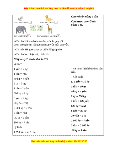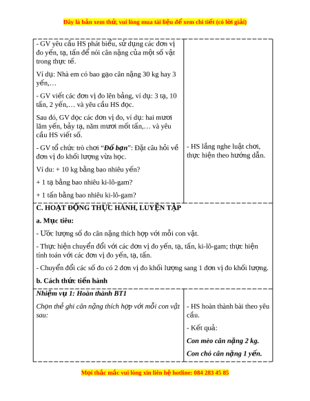 - GV yêu cầu HS phát bi u, s ể ử d ng các ụ đ n v ơ ị đo y n, t ế , t ạ ấn đ nói ể cân n ng ặ c a m ủ t ộ số v t ậ trong th c ự t . ế Ví d : ụ Nhà em có bao g o cân n ạ ng ặ 30 kg hay 3 y n,… ế - GV vi t ế các đ n v ơ đo l ị ên b ng, ví ả d : ụ 3 t , ạ 10 tấn, 2 y n,… ế và yêu cầu HS đ c. ọ Sau đó, GV đ c ọ các đ n ơ v đo, ví ị d : ụ hai mư i ơ lăm y n, b ế y t ả , ạ năm mư i ơ m t ố t n,… và ấ yêu cầu HS vi t ế số. - GV tổ ch c t ứ rò ch i ơ “Đố b n ạ ”: Đ t ặ câu h i ỏ về - HS l ng nghe l ắ u t ậ ch i ơ , đ n v ơ ị đo khối lư ng ợ v a h ừ c. ọ th c ự hi n t ệ heo hư ng ớ d n. ẫ Ví du: + 10 kg b ng bao nhi ằ êu y n? ế + 1 t b ạ ng ằ bao nhiêu ki-lô-gam? + 1 tấn b ng ằ bao nhiêu ki-lô-gam? C. HOẠT Đ N Ộ G TH C Ự HÀNH, LUY N Ệ T P Ậ a. Mục tiêu: - c Ướ lư ng s ợ ố đo cân n ng t ặ hích h p v ợ i ớ m i ỗ con v t ậ . - Th c ự hiện chuy n ể đổi v i ớ các đ n v ơ đo y ị n, t ế , ạ t n, ki ấ -lô-gam; th c ự hi n ệ tính toán v i ớ các đ n ơ v đo y ị n, ế t , t ạ n. ấ - Chuy n