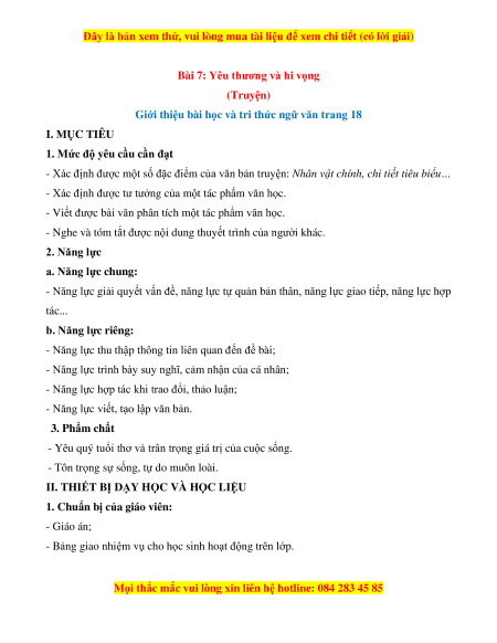Giới thiệu bài học và tri thức ngữ văn trang 18 I. MỤC TIÊU