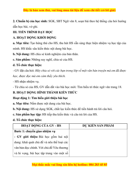 2. Chuẩn bị của học sinh: SGK, SBT Ngữ văn 8, soạn bài theo hệ thống câu hỏi hướng dẫn học bài, vở ghi.