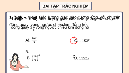 1 (Sgk – tr42) Góc l n ượ g giác nào t n ươ g n ứ g v i ớ chuy n ể đ n ộ g quay vòng ng c ượ chi u k ề im đ n ồ g hồ C . A. B. D. BÀI T P Ậ TR C Ắ NGHI M Ệ 2 (