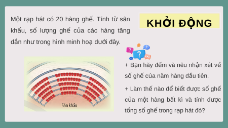 CHÀO M N Ừ G CÁC EM Đ N Ế V I Ớ BÀI GI N Ả G HÔM NAY M t ộ r p ạ hát có 20 hàng gh . ế Tính t ừ sân KHỞI ĐỘNG khấu, s ố lư n ợ g gh ế c a ủ các hàng tăng