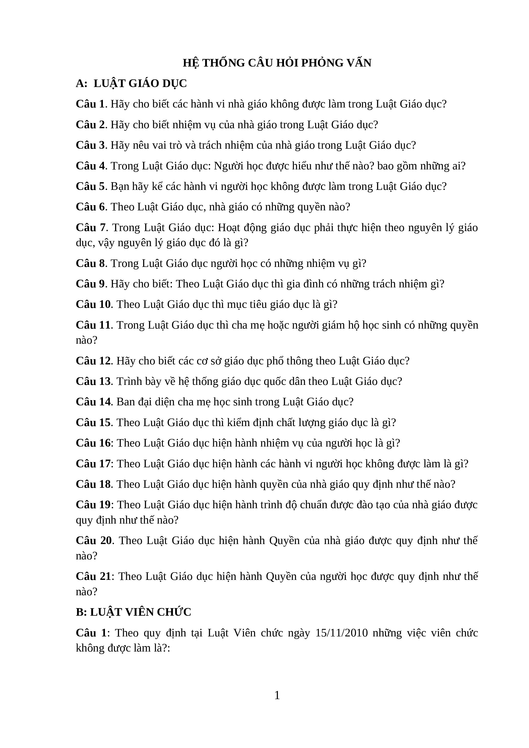 HỆ THỐNG CÂU HỎI PHỎNG VẤN A: LUẬT GIÁO DỤC