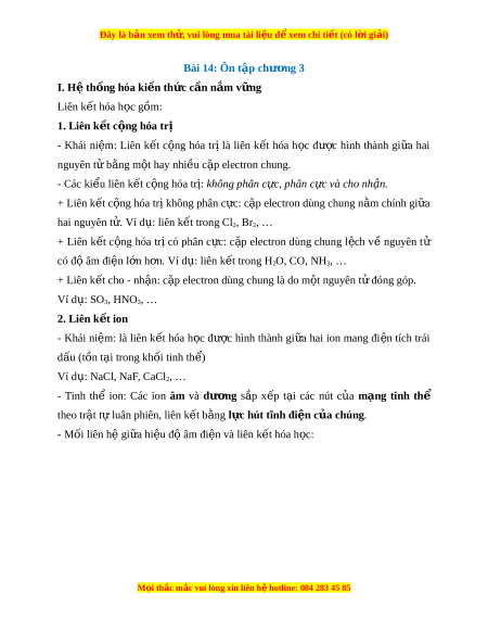 Đây là bản xem th , vu ử i lòng mua tài li u ệ đ xe ể m chi ti t (c ế ó l i ờ gi i ả ) Bài 14: Ôn t p ch ậ ư ng ơ 3 I. H t ệ h ng hóa ki ố n t ế h c c ứ n n ầ m ắ v ng ữ Liên k t ế hóa h c ọ g m ồ : 1. Liên k t ế c ng ộ hóa trị - Khái ni m ệ : Liên k t ế c ng ộ hóa trị là liên k t ế hóa h c ọ đư c ợ hình thành gi a ữ hai nguyên tử b ng m ằ t ộ hay nhi u c ề p el ặ ectron chung. - Các ki u ể liên k t ế c ng hóa t ộ r : ị không phân c c, ự phân c c và ự cho nh n. ậ + Liên k t ế c ng hóa t ộ r không phân c ị c: ự c p ặ electron dùng chung n m ằ chính gi a ữ