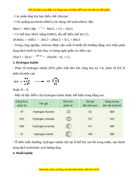 Đây là bản xem th , vu ử i lòng mua tài li u ệ đ xe ể m chi ti t (c ế ó l i ờ gi i ả ) - Các ph n ả ng hóa h ứ c ọ đi u ch ề chl ế orine: + Cho qu ng pyr ặ olusite (MnO2) tác d ng v ụ i ớ hydrochloric đ c: ặ o MnO t 2 + 4HCl đ c ặ MnCl2 + Cl2 + 2H2O + Có th t ể hay MnO2 b ng K ằ MnO4 r n đ ắ ể đi u ề ch khí ế Cl2: