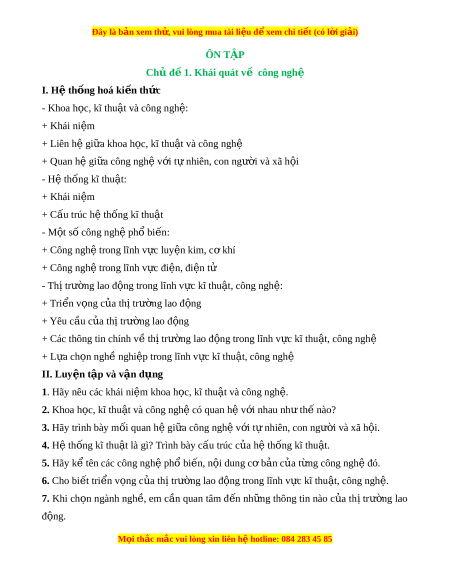 Đây là bản xem th , vu ử i lòng mua tài li u ệ đ xe ể m chi ti t (c ế ó l i ờ gi i ả ) ÔN T P Ậ Chủ đ 1. K ề hái quát v công ngh ề ệ I. H t ệ h ng hoá ki ố n t ế h c ứ - Khoa h c, ọ kĩ thu t ậ và công ngh : ệ + Khái ni m ệ + Liên h gi ệ a khoa h ữ c, kĩ ọ thu t ậ và công nghệ + Quan h gi ệ a ữ công ngh v ệ i ớ t nhi ự ên, con ngư i ờ và xã h i ộ - H t ệ hống kĩ thu t ậ : + Khái ni m ệ + Cấu trúc h t ệ hống kĩ thu t ậ - M t