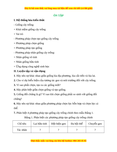 ử vui lòng mua tài li u ệ đ xe ể m chi ti t ế (có l i ờ gi i ả ) ÔN T P Ậ I. H t ệ h ng hóa ki ố n t ế h c ứ - Giống cây trồng: + Khái ni m ệ gi ng cây t ố r ng ồ + Vai trò - Phư ng pháp ch ơ n ọ t o gi ạ ng cây t ố r ng ồ + Phư ng pháp ơ ch n gi ọ ng ố + Phư ng pháp ơ t o gi ạ ng ố - Phư ng pháp nhân gi ơ ống cây trồng: + Nhân giống vô tính + Nhân giống h u t ữ ính + ng d Ứ ng công ụ ngh s ệ inh h c ọ II. Luy n t ệ p và v ậ n d ậ ng ụ 1. Hãy nêu s khác ự nhau gi a gi ữ ống lúa đ a ph ị ư ng, l ơ úa c i ả ti n và l ế úa lai. 2. Cho ví d bi ụ u hi ể n c ệ a t ủ ư ng t ơ ác gen và môi trư ng ờ đ i ố v i ớ cây tr ng. ồ 3. Vì sao ph i ả ch n, ọ t o r ạ a các gi ng m ố i ớ ? 4. Hãy phân bi t ệ gi a ữ ch n gi ọ ng và t ố o gi ạ ng. ố