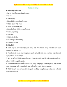 1. Trình bày vai trò, tri n ể v ng ọ c a ủ tr ng ồ tr t ọ ở Vi t ệ Nam trong b i ố c nh ả cuộ cách amngj công nghi p 4.0 ệ 2. Phân lo i ạ các nhóm cây tr ng ồ theo ngu n ồ g c, ố đ c ặ tính sinh v t ậ h c, ọ m c ụ đích sử d ng. C ụ ho ví d m ụ inh h a. ọ 3. Nêu các y u ế t ố chính trong tr ng ồ tr t ọ . Phân tích m i ố quan h ệ gi a ữ cây tr ng ồ v i ớ các y u t ế ố chính trong tr ng t ồ r t ọ . 4. Nêu m t ộ số thành tự n i ổ b t ậ c a ủ ng ứ d ng