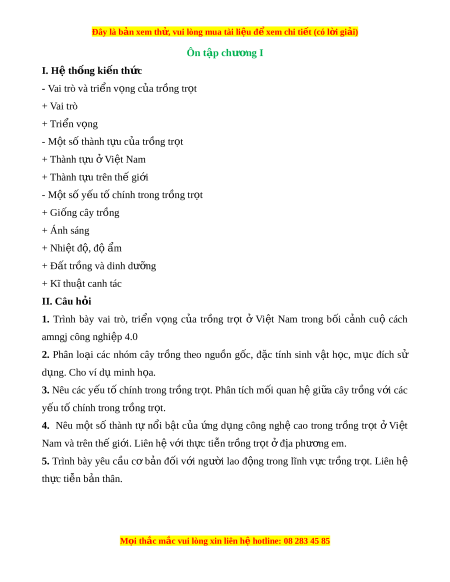 Đây là bản xem th , vu ử i lòng mua tài li u ệ đ xe ể m chi ti t (c ế ó l i ờ gi i ả ) Ôn t p ch ậ ư ng I ơ I. H t ệ h ng ki ố n t ế h c ứ - Vai trò và tri n v ể ng c ọ a t ủ r ng t ồ r t ọ + Vai trò + Tri n v ể ng ọ - M t ộ số thành t u c ự a t ủ rồng tr t ọ + Thành t u ự ở Vi t ệ Nam + Thành t u t ự rên th gi ế i ớ - M t ộ số y u t ế ố chính trong tr ng t ồ r t ọ + Giống cây trồng + Ánh sáng + Nhi t ệ đ , đ ộ ộ m ẩ