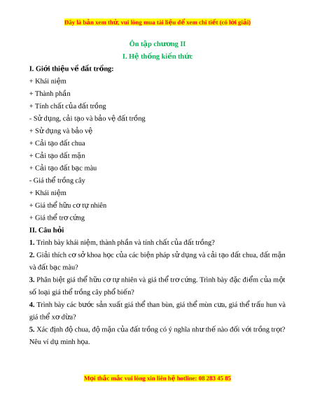 Đây là bản xem th , vu ử i lòng mua tài li u ệ đ xe ể m chi ti t (c ế ó l i ờ gi i ả ) Ôn tập chư ng ơ II I. H t ệ h ng ki ố n t ế h c ứ I. Gi i ớ thi u v ệ đ ề t ấ tr ng: ồ + Khái ni m ệ + Thành ph n ầ + Tính ch t ấ c a đ ủ t ấ tr ng ồ - S d ử ng, c ụ i ả t o và b ạ o ả v đ ệ t ấ tr ng ồ + S d ử ng và ụ b o v ả ệ + C i ả t o đ ạ t ấ chua + C i ả t o đ ạ t ấ m n ặ + C i ả t o đ ạ t ấ b c ạ màu - Giá th t ể r ng cây ồ + Khái ni m ệ + Giá th h ể u ữ c t ơ nhi ự ên + Giá th t ể r c ơ ng ứ II. Câu h i ỏ