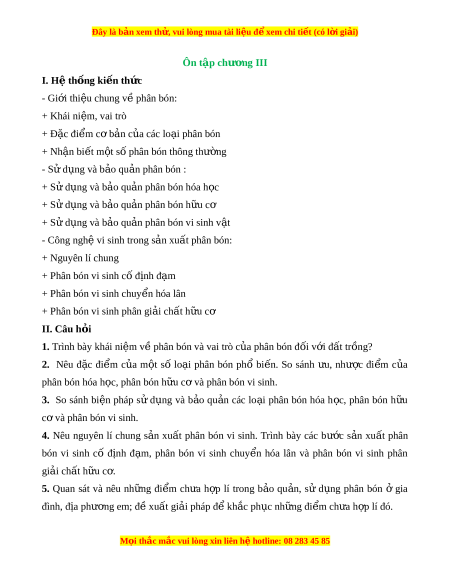 Đây là bản xem th , vu ử i lòng mua tài li u ệ đ xe ể m chi ti t (c ế ó l i ờ gi i ả ) Ôn tập chư ng ơ III I. H t ệ h ng ki ố n t ế h c ứ - Gi i ớ thi u chung v ệ phân bón: ề + Khái ni m ệ , vai trò + Đ c ặ đi m ể c b ơ n ả c a các ủ lo i ạ phân bón + Nh n ậ bi t ế m t ộ s phân bón t ố hông thư ng ờ - S d ử ng và b ụ o ả qu n phân bón : ả + S d ử ng và ụ b o qu ả n ả phân bón hóa h c ọ + S d ử ng và ụ b o qu ả n ả phân bón h u c ữ ơ + S d ử ng và ụ b o qu ả n ả phân bón vi sinh v t ậ - Công ngh vi ệ sinh trong s n ả xu t ấ phân bón: + Nguyên lí chung + Phân bón vi sinh c đ ố nh đ ị m ạ