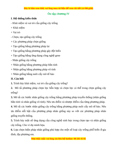 Đây là bản xem th , vu ử i lòng mua tài li u ệ đ xe ể m chi ti t (c ế ó l i ờ gi i ả ) Ôn tập chư ng ơ IV I. H t ệ h ng ki ố n t ế h c ứ - Khái ni m ệ và vai trò c a ủ gi ng cây t ố r ng ồ + Khái ni m ệ + Vai trò - Ch n, ọ t o gi ạ ng cây t ố r ng ồ + Các phư ng pháp ơ ch n gi ọ ng ố + T o gi ạ ống b ng ằ phư ng pháp l ơ ai + T o gi ạ ống b ng ằ phư ng pháp gây ơ đ t ộ bi n ế + T o gi ạ ống b ng ằ ng d ứ ng công ngh ụ gene ệ - Nhân giống cây trồng + Nhân giống b ng ằ phư ng pháp h ơ u t ữ ính + Nhân giống b ng ằ phư ng pháp vô t ơ ính + Nhân giống b ng ằ nuôi c y m ấ ô t bào ế II. Câu h i ỏ