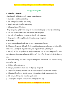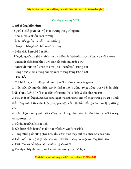 Đây là bản xem th , vu ử i lòng mua tài li u ệ đ xe ể m chi ti t (c ế ó l i ờ gi i ả ) Ôn t p ch ậ ư ng ơ VIII I. H t ệ h ng ki ố n t ế h c ứ - S c ự ần thi t ế ph i ả b o ả v m ệ ôi trư ng t ờ rong tr ng t ồ r t ọ + Khái ni m ệ ô nhi m ễ môi trư ng ờ + nh h Ả ư ng ở c a ô nhi ủ m ễ môi trư ng ờ + Nguyên nhân gây ô nhi m ễ môi trư ng ờ + Bi n pháp ệ h n ch ạ ô nhi ế m ễ - ng d Ứ ng công ngh ụ ệ vi sinh trong x l ử í ch t ấ th i ả tr ng t ồ r t ọ và b o ả v m ệ ôi trư ng ờ + S n ả xu t ấ phân bón h u ữ c vi ơ sinh t ch ừ t ấ th i ả tr ng t ồ r t ọ + S n ả xu t ấ th c ăn ứ chua cho t ủ râu, bò t ch ừ t ấ th i ả tr ng t ồ r t ọ + Công ngh vi ệ sinh trong b o ả v m ệ ôi trư ng t ờ rong tr ng t ồ r t ọ II. Câu h i ỏ 1. Trình bày s c ự ần thi t ế ph i ả b o ả v m ệ ôi trư ng ờ trong tr ng t ồ r t ọ 2. Nêu m t
