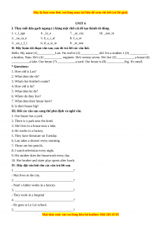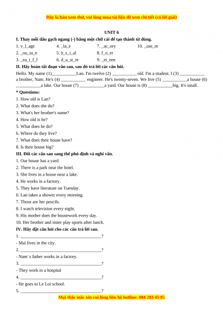 ___________a lake. Our house (7) ___________a yard. Our house is (8) ___________big. It's small. * Questions: 1. How old is Lan? 2. What does she do? 3. What's her brother's name? 4. How old is he? 5. What does he do? 6. Where do they live? 7. What does their house have? 8. Is their house big?