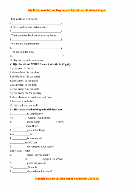 V. Đặt câu hỏi với WHERE và trả lời với các từ gợi ý. 1. your pen / in the box 2. the students / in the class 3. the children / in the room 4. her father / in the house 5. his pencil / in the desk. 6. your eraser / on the table 7. your house / in the country