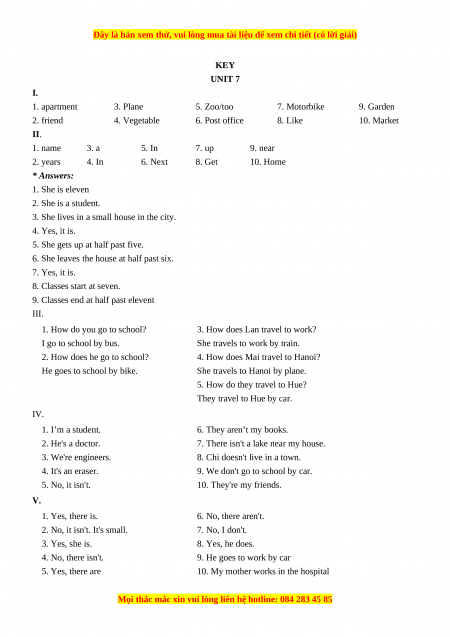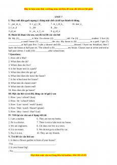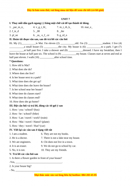 Học kỳ 1: Phần 1 Các bài tập theo từng đơn vị bài học - Unit 7- Giáo viên Mai Lan Hương đầy đủ đáp án