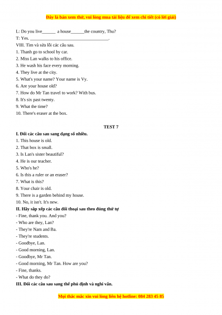 I. Đổi các câu sau sang dạng số nhiều. 1. This house is old. 2. That box is small. 3. Is Lan's sister beautiful? 4. He is our teacher. 5. Who's he?