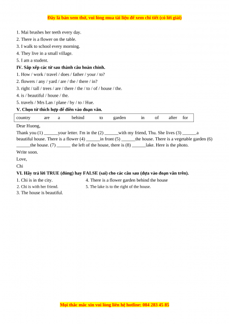 V. Chọn từ thích hợp để điền vào đoạn văn. country are a behind to garden in of after for Dear Huong,