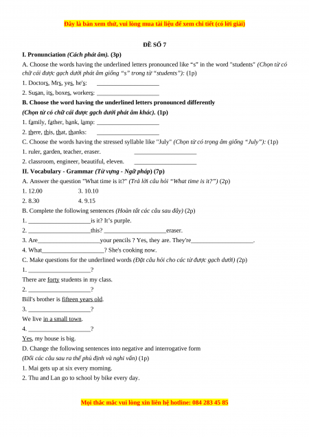 Học kỳ 1: Phần 2 Một số đề kiểm tra học kỳ 1 - Mục A- Đề số 7-Giáo viên Mai Lan Hương đầy đủ đáp án