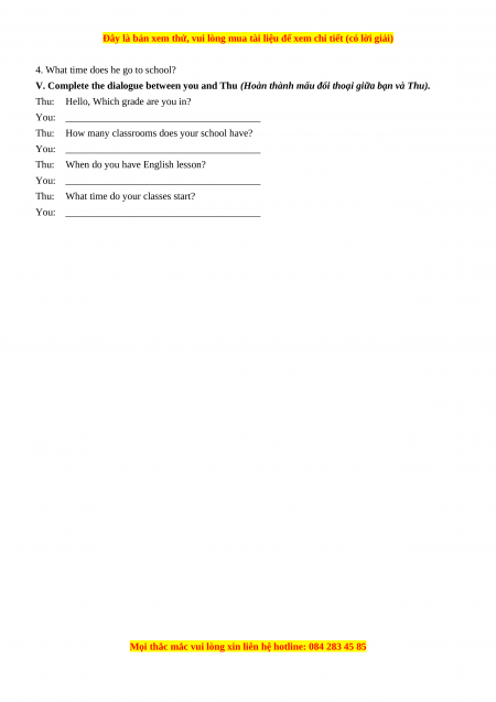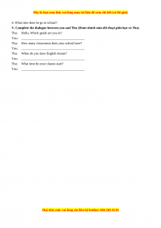 V. Complete the dialogue between you and Thu (Hoàn thành mẩu đối thoại giữa bạn và Thu). Thu: Hello, Which grade are you in?