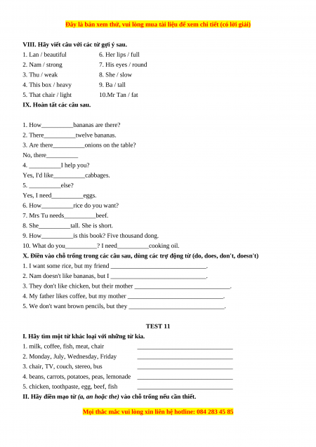 VIII. Hãy viết câu với các từ gợi ý sau. 1. Lan / beautiful 6. Her lips / full 2. Nam / strong 7. His eyes / round 3. Thu / weak 8. She / slow 4. This box / heavy 9. Ba / tall 5. That chair / light 10.Mr Tan / fat