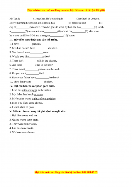 1. Hai likes some iced tea. 2. Quang wants some eggs. 3. They want some water. 4. Lan has some fruits. 5. We have some beans.