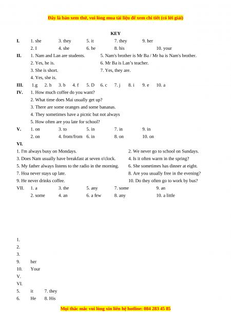 KEY I. 1. she 3. they 5. it 7. they 9. her 2. I 4. she 6. he 8. his 10. your II. 1. Nam and Lan are students.