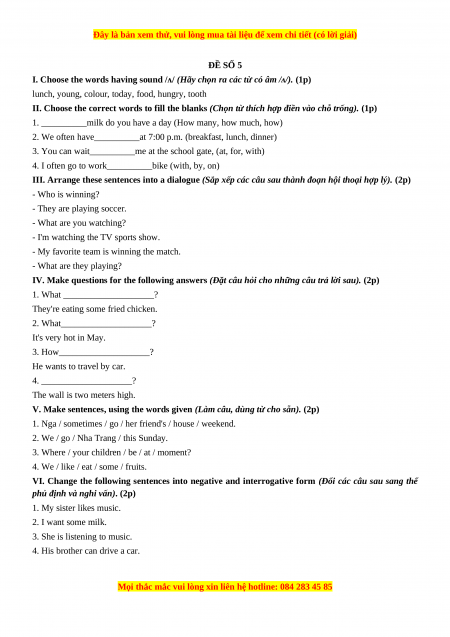 Học kỳ 2: Phần 2 Một số đề kiểm tra học kỳ 2 - Mục A- Đề số 5-Giáo viên Mai Lan Hương đầy đủ đáp án