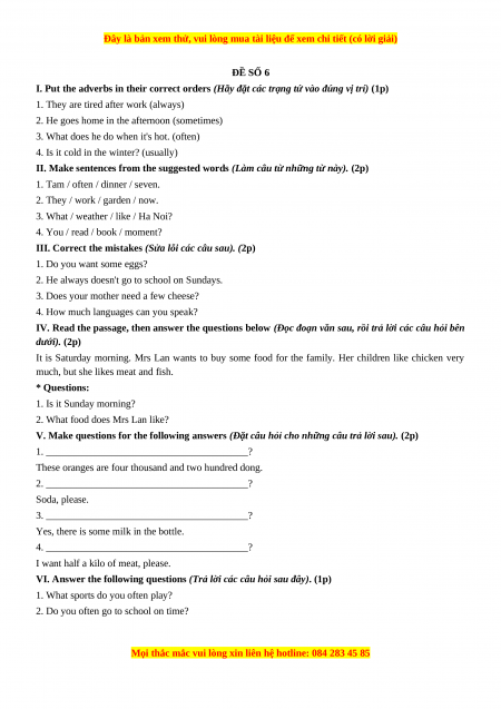 Học kỳ 2: Phần 2 Một số đề kiểm tra học kỳ 2 - Mục A- Đề số 6-Giáo viên Mai Lan Hương đầy đủ đáp án