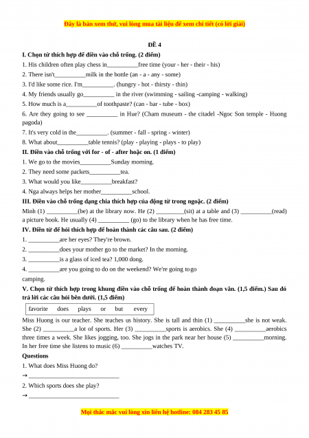 Học kỳ 2: Phần 2 Một số đề kiểm tra học kỳ 2 - Mục B- Đề kiểm tra học kì số 4-Giáo viên Mai Lan Hương đầy đủ đáp án