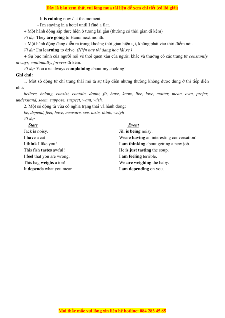 be, depend, feel, have, measure, see, taste, think, weigh Ví dụ: State Event Jack is noisy. Jill is being noisy. I have a cat