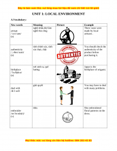 UNIT 1: LOCAL ENVIRONMENT A.Vocabulary: New words Meaning Picture Example nghệ nhân,thợ làm There vases were artisan nghề thủ công made by local /ˈɑːtɪ’zæn/ artisans . (n) tính chính xác, tính You should check the authenticity xác thực, thật authenticity of the /ˌɔːθenˈtɪsəti/ product before (n) purchasing it. nơi sinh ra, quê Japan is the birthplace hương birthplace of origami. /ˈbɜːθpleɪs/ (n) giải quyết You may have to deal deal with with many problems. /diːl wɪð/ thêu She embroidered embroider floral patterns on the /ɪmˈbrɔɪdə(r)/ dress. (v)