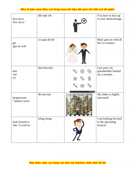 đối mặt với You have to face up face up to to your shortcomings. /feɪs ʌp tu / có quan hệ tốt Mary gets on with all get her co-workers . /get ɒn wɪð/ đan (len,sợi) Last year, my knit grandmother knitted /nɪt/ me a sweater. (v) đồ sơn mài My father is highly lacquerware interested /ˈlækə(r) weər/ trông mong I am looking forward look foward to to the upcoming /lʊk ˈfɔːwəd tu/ festival.