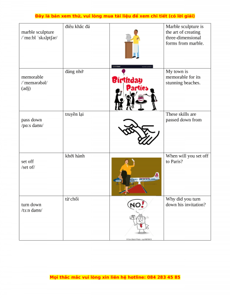 điêu khắc đá Marble sculpture is marble sculpture the art of creating /ˈmɑːbl ˈskʌlptʃər/ three-dimensional forms from marble. đáng nhớ My town is memorable memorable for its /ˈmemərəbəl/ stunning beaches. (adj) truyền lại These skills are pass down passed down from /pɑːs daʊn/ khởi hành When will you set off set off to Paris? /set ɒf/ từ chối Why did you turn turn down down his invitation? /tɜːn daʊn/