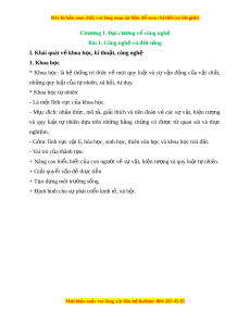 Bài 1. Công ngh và đ ệ i ờ s ng ố I. Khái quát v k ề hoa h c, ọ kĩ thu t ậ , công nghệ 1. Khoa h c ọ * Khoa h c: ọ là hệ th ng ố tri th c ứ v ề m i ọ quy lu t ậ và s ự v n ậ đ ng ộ c a ủ v t ậ ch t ấ , nh ng quy l ữ u t ậ c a t ủ nhi ự ên, xã h i ộ , t duy ư . * Khoa h c t ọ nhi ự ên: - Là m t ộ lĩnh v c ự c a khoa h ủ c. ọ - M c ụ đích: nh n ậ th c, ứ mô t , ả gi i ả thích và tiên đoán v ề các s ự v t ậ , hi n ệ tư ng ợ và quy lu t ậ tự nhiên d a ự trên nh ng ữ b ng ằ ch ng ứ có đư c ợ từ quan sát và th c ự nghiệm. - Gồm: lĩnh v c ự v t ậ lí, hóa h c, s ọ inh h c, t ọ hiên văn h c ọ và khoa h c ọ trái đ t ấ . - Vai trò c a t ủ hành t u: ự + Nâng cao hi u bi ể t ế c a con ủ ngư i ờ v s ề v ự t ậ , hi n t ệ ư ng và quy l ợ u t ậ t nhi ự ên. + Gi i ả quy t ế v n đ ấ ề th c t ự i n ễ + T o d ạ ng m ự ôi trư ng ờ s ng ố