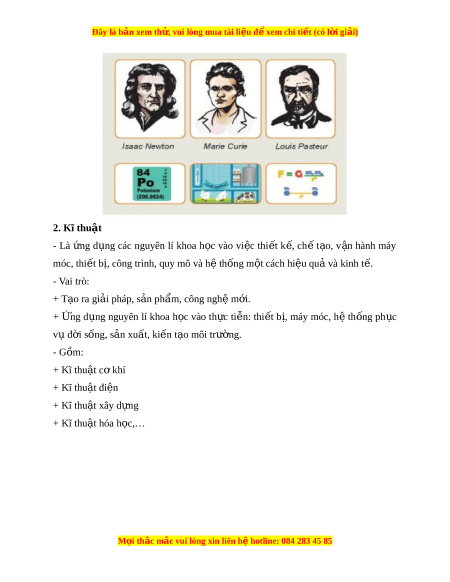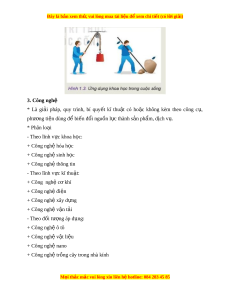 Đây là bản xem th , vu ử i lòng mua tài li u ệ đ xe ể m chi ti t (c ế ó l i ờ gi i ả ) 2. Kĩ thuật - Là ng ứ d ng ụ các nguyên lí khoa h c ọ vào vi c ệ thi t ế k , ế ch ế t o, ạ v n ậ hành máy móc, thi t ế b , công t ị rình, quy mô và h t ệ h ng m ố t ộ cách hi u qu ệ và ki ả nh t . ế - Vai trò: + T o r ạ a gi i ả pháp, s n ả ph m ẩ , công ngh m ệ i ớ . + ng Ứ d ng ụ nguyên lí khoa h c ọ vào th c ự ti n: ễ thi t ế b ,ị máy móc, h ệ th ng ố ph c ụ v đ ụ i ờ sống, s n ả xu t ấ , ki n ế t o m ạ ôi trư ng. ờ - Gồm: + Kĩ thu t ậ c khí ơ + Kĩ thu t ậ đi n ệ + Kĩ thu t ậ xây d ng ự + Kĩ thu t ậ hóa h c,… ọ M i