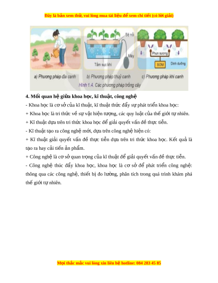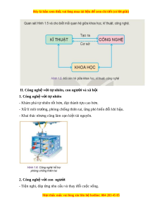 Đây là bản xem th , vu ử i lòng mua tài li u ệ đ xe ể m chi ti t (c ế ó l i ờ gi i ả ) 4. M i ố quan h gi ệ a khoa h ữ c, kĩ ọ thu t ậ , công nghệ - Khoa h c ọ là c s ơ ở c a kĩ ủ thu t ậ , kĩ thu t ậ th c đ ứ y s ẩ phát ự tri n khoa h ể c: ọ + Khoa h c ọ là tri th c ứ v s ề v ự t ậ hi n t ệ ư ng, các quy l ợ u t ậ c a t ủ h gi ế i ớ t nh ự iên. + Kĩ thu t ậ d a t ự rên tri th c khoa h ứ c ọ đ gi ể i ả quy t ế v n đ ấ t ề h c ự ti n. ễ - Kĩ thu t ậ t o ạ ra công ngh m ệ i ớ , d a ự trên công ngh hi ệ n có: ệ + Kĩ thu t ậ gi i ả quy t ế v n ấ đề th c ự ti n ễ d a ự trên tri th c ứ khoa h c. ọ K t ế quả là t o ạ ra hay c i ả ti n ế n ả ph m ẩ . + Công ngh l ệ à c s ơ ở quan tr ng ọ c a kĩ ủ thu t ậ đ g ể i i ả quy t ế v n đ ấ t ề h c t ự i n. ễ - Công nghệ thúc đ y ẩ khoa h c, ọ khoa h c