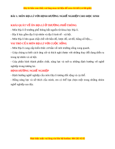 Đây là bản xem th , vu ử i lòng mua tài li u ệ đ xe ể m chi ti t ế (có l i ờ gi i ả ) BÀI 1. MÔN Đ A Ị LÍ V I Ớ ĐỊNH HƯ N Ớ G NGH N Ề GHI P Ệ CHO H C Ọ SINH KHÁI QUÁT V Ô Ề N Đ A Ị LÍ Ở TRƯ N Ờ G PH Ổ THÔNG - Môn Địa lí t ở rư ng ph ờ ổ thông b t ắ nguồn t khoa h ừ c ọ Đ a l ị í. - Địa lí h c g ọ ồm đ a ị lí tự nhiên và đ a l ị í kinh t - ế xã h i ộ .