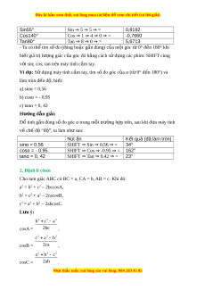 Để tính gần đúng số đo góc α trong mỗi trư ng ờ h p t ợ rên, sau khi đ a ư máy tính v ch ề ế đ “đ ộ ”, ộ ta làm nh s ư au: Nút n ấ K t ế qu ả (đã làm tròn) sinα = 0,56 SHIFT ⇒ Sin ⇒ 0,56 ⇒ = 34° cosα = - 0,95 SHIFT ⇒ Cos ⇒ -0.95 ⇒ = 162° tanα = 0, 42 SHIFT ⇒ Tan ⇒ 0.42 ⇒ = 23° 2. Đ nh l ị í côsin