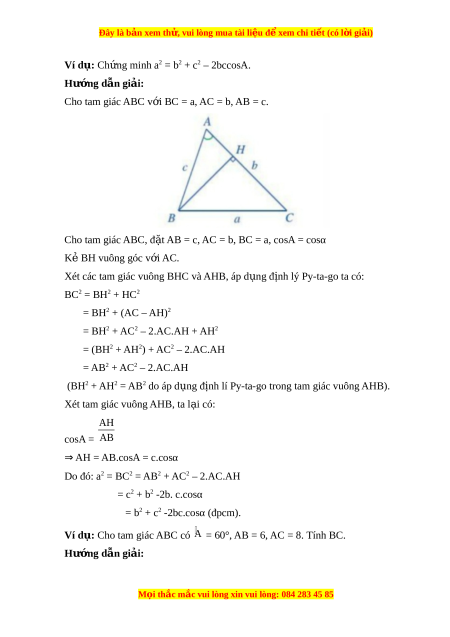 Cho tam giác ABC có BC = a, CA = b, AB = c. Khi đó: a2 = b2 + c2 – 2bccosA, b2 = c2 + a2 – 2cacosB, c2 = a2 + b2 – 2abcosC. Lưu ý: 2 2 2 b c a cosA = 2bc , 2 2 2 c a b cosB = 2ca , 2 2 2 a b c cosC = 2ab . M i ọ thắc m c