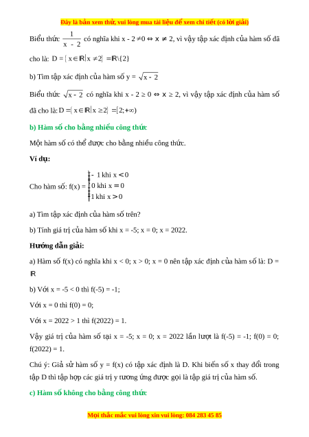 Cho hàm số: f(x) = í 0 khi x =0 ïïï1khi x>0 ïî a) Tìm t p xác ậ đ nh c ị a ủ hàm s t ố rên? b) Tính giá tr c ị a ủ hàm s khi ố x = -5; x = 0; x = 2022. Hư ng d ớ ẫn gi i ả :