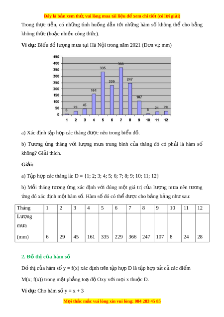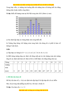 ữ hàm số không thể cho b ng ằ không th c ứ (ho c ặ nhi u công t ề h c) ứ . Ví dụ: Bi u đ ể ồ lư ng m ợ a t ư i ạ Hà N i ộ trong năm 2021 (Đ n v ơ : ị mm) a) Xác định t p ậ h p các t ợ háng đư c ợ nêu trong bi u đ ể . ồ b) Tư ng ơ ng ứ tháng v i ớ lư ng ợ m a ư trung bình c a ủ tháng đó có ph i ả là hàm số không? Gi i ả thích. Giải: a) T p h ậ p các t ợ
