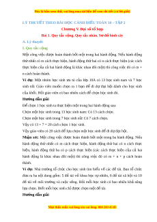 Đây là bản xem th , vu ử i lòng mua tài li u ệ đ xe ể m chi ti t ế (có l i ờ gi i ả ) LÝ THUY T Ế THEO BÀI H C Ọ CÁNH DI U Ề TOÁN 10 – T P Ậ 2 Chư ng ơ V. Đại s t ố h ổ p ợ Bài 1. Quy t c c ắ ng. Q ộ uy t c n ắ hân. S đ ơ h ồ ình cây A. Lý thuy t ế I. Quy tắc c ng ộ M t ộ công vi c ệ đư c ợ hoàn thành b i ở m t ộ trong hai hành đ ng. ộ N u ế hành đ ng ộ th nh ứ ất có m cách th c hi ự n, ệ hành đ ng ộ th ứ hai có n cách th c ự hi n ( ệ các cách th c ự hi n ệ c a ủ cả hai hành đ ng ộ là khác nhau đôi m t ộ ) thì công vi c ệ đó có m + n cách hoàn thành. Ví d : ụ M t ộ nhóm h c ọ sinh u ư tú c a ủ l p ớ 10A có 13 h c ọ sinh nam và 7 h c ọ sinh n . ữ Giáo viên mu n ố ch n ọ ra 1 b n ạ để đi dự đ i ạ h i ộ dành cho h c ọ sinh c a kh ủ ối. H i
