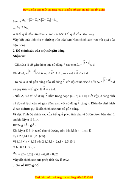 Đây là bản xem th , vu ử i lòng mua tài li u ệ đ xe ể m chi ti t (c ế ó l i ờ gi i ả ) C C C C Suy ra 1 C 1 2 C2 . ⇒ 1 C C2 . ⇒ K t ế qu c ả a ủ b n N ạ am chính xác h n k ơ t ế qu c ả a b ủ n ạ Long. V y ậ k t ế quả tính chu vi đư ng ờ tròn c a ủ b n ạ Nam chính xác h n ơ k t ế qu ả c a ủ b n ạ Long.