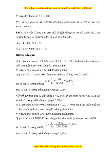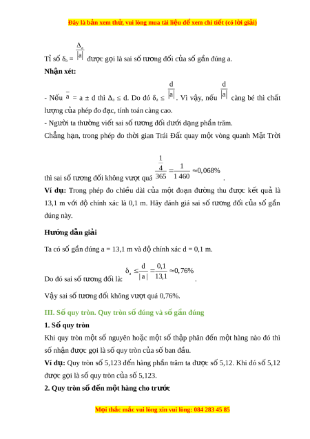Đây là bản xem th , vu ử i lòng mua tài li u ệ đ xe ể m chi ti t ế (có l i ờ gi i ả ) a Tỉ số δ a a = đư c ợ g i ọ là sai s t ố ư ng đ ơ i ố c a s ủ g ố n đúng a. ầ Nhận xét: d d - N u ế a = a ± d thì ∆ a a a ≤ d. Do đó δa ≤ . Vì v y ậ , n u ế càng bé thì ch t ấ lư ng c ợ a ủ phép đo đ c, t ạ ính toán càng cao. - Ngư i ờ ta thư ng vi ờ t ế sai s t ố ư ng đ ơ i ố dư i ớ d ng ạ ph n t ầ răm. Ch ng ẳ h n, ạ trong phép đo th i ờ gian Trái Đ t ấ quay m t ộ vòng quanh M t ặ Tr i ờ 1 1 4 0 ,068% thì sai số tư ng ơ đ i ố không vư t ợ quá 365 1 460 . Ví d :