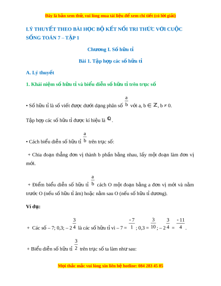 Ố G TOÁN 7 – TẬP 1 Chư ng I ơ . S h ố u ữ tỉ Bài 1. T p h ậ p các ợ số h u t ữ ỉ A. Lý thuy t ế 1. Khái ni m ệ s h ố u t ữ và bi ỉ u di ể n s ễ h ố u t ữ t ỉ rên tr c s ụ ố a • Số h u t ữ ỉ là số vi t ế đư c d ợ ư i ớ d ng phân s ạ ố b v i ớ a, b ∈ , b ≠ 0. T p h ậ p ợ các số h u t ữ ỉ đư c ợ kí hi u l ệ à . a • Cách bi u di ể n s ễ ố h u ữ tỉ b trên tr c ụ s : ố + Chia đo n ạ th ng ẳ đ n ơ vị thành b ph n ầ b ng ằ nhau, l y ấ m t ộ đo n ạ làm đ n ơ vị m i ớ . a + Đi m ể bi u ể di n ễ số h u ữ tỉ b cách O m t ộ đo n ạ b ng ằ a đ n ơ vị m i ớ và n m ằ trư c O ớ (n u s ế ố h u ữ t âm ỉ ) ho c ặ n m ằ sau O (n u s ế ố h u t ữ d ỉ ư ng) ơ . Ví d : ụ 3 7 3 3 11 + Các s