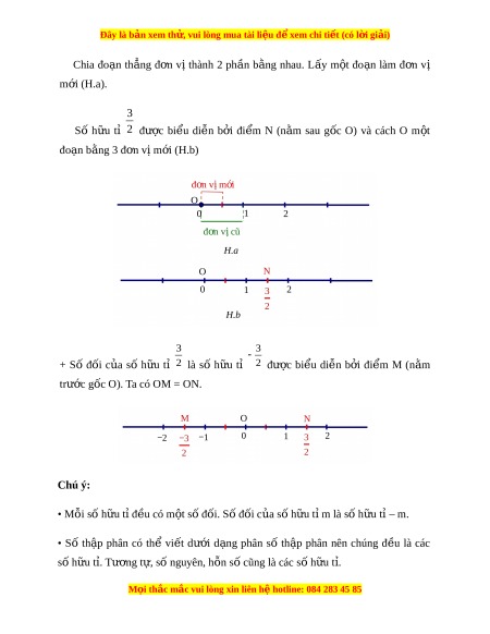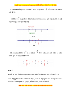 Đây là bản xem th , vu ử i lòng mua tài li u ệ đ xe ể m chi ti t (c ế ó l i ờ gi i ả ) Chia đo n ạ th ng ẳ đ n ơ vị thành 2 ph n ầ b ng ằ nhau. L y ấ m t ộ đo n ạ làm đ n ơ vị m i ớ (H.a). 3 Số h u ữ tỉ 2 đư c ợ bi u ể di n ễ b i ở đi m ể N (n m ằ sau g c ố O) và cách O m t ộ đo n ạ b ng 3 đ ằ n ơ v m ị i ớ (H.b) 3 3 + Số đ i ố c a ủ số h u ữ tỉ 2 là số h u ữ tỉ 2 đư c ợ bi u ể di n ễ b i ở đi m ể M (n m ằ trư c g ớ ốc O). Ta có OM = ON. Chú ý: • Mỗi số h u t ữ ỉ đ u ề có m t