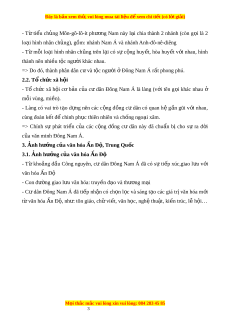 ủ cư dân Đông Nam Á là làng (v i ớ tên g i ọ khác nhau ở mỗi vùng, mi n ề ). - Làng có vai trò t o ạ d ng ự nên các c ng ộ đ ng ồ c ư dân có quan h ệ g n ầ gũi v i ớ nhau, cùng đoàn k t ế đ chi ể nh ph c t ụ hiên nhiên và ch ng ngo ố i ạ xâm. => Chính sự phát tri n ể c a ủ các c ng ộ đ ng ồ cư dân này đã chu n ẩ bị cho sự ra đ i ờ c a ủ văn minh Đông Nam Á. 3. Ảnh hư ng c ở a văn hóa ủ n Đ Ấ , ộ Trung Qu c ố 3.1. Ảnh hư ng c ở a văn hóa ủ n Đ Ấ ộ - Từ kho ng ả đ u ầ Công nguyên, c