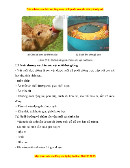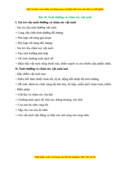 Bài 10. Nuôi dư ng và chă ỡ m sóc v t ậ nuôi I. Vai trò c a nuôi ủ dư ng ỡ và chăm sóc v t ậ nuôi - Vai trò c a nuôi ủ dư ng v ỡ t ậ nuôi: + Cung c p ch ấ t ấ dinh dư ng ỡ đ l ủ ư ng ợ + Phù h p v ợ i ớ t ng ừ giai đo n ạ + Phù h p v ợ i ớ t ng ừ đ i ố tư ng ợ - Vai trò c a chăm ủ sóc v t ậ nuôi: + T o m ạ ôi trư ng phù h ờ p ợ + V s ệ inh chuồng nuôi s ch ạ sẽ + Đ m ả b o v ả t ậ nuôi s ng t ố ho i ả mái, kh e m ỏ nh ạ và cho nhi u s ề n ph ả m ẩ nh t ấ .